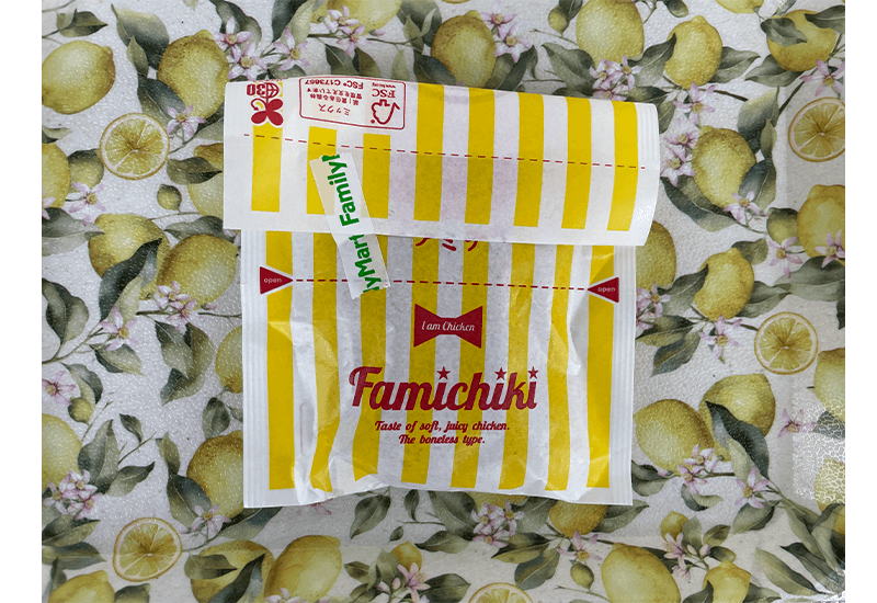 Passons maintenant au Fami-chiki ! Tout de suite, l'emballage est beaucoup plus joli et donne envie. Il est cependant un poil moins pratique à ouvrir, mais rien d'impossible non plus. Le poulet en lui même est visuellement plus classique, plat, et pas vraiment beau (là où celui de 7-Eleven avait une forme plus proche d'un "vrai" poulet). Pour ce qui est de la texture, contrairement à ce qu'on pouvait attendre après l'avoir vu, le Fami-chiki est très gras, ce qui rend la panure plutôt molle, mais forcément très peu sec. Le goût est dans la continuité de la texture, beaucoup plus gras, mais avec moins de blanc que celui de 7-Eleven, qui plaira un peu moins au plus grand nombre.